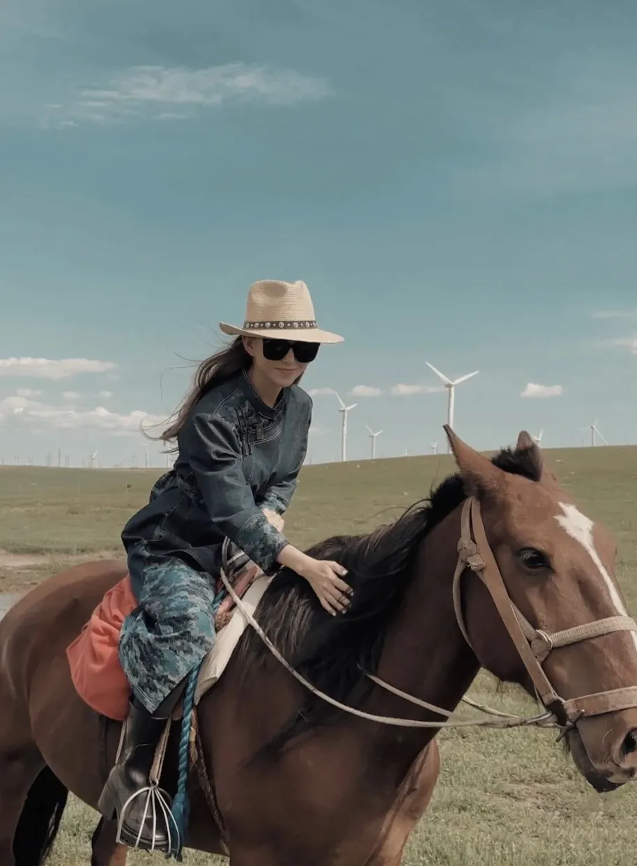她先是晒出一张自己2023年的骑马旧照,随后又分享了一张红酒架的照片。