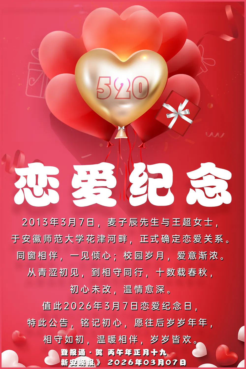 2013年3月7日,麦子辰先生与王超女士,于安徽师范大学花津河畔,正式确定恋爱关系。同窗相伴,一见倾心;校园岁月,爱意渐浓。从青涩初见,到相守同行,十数载春秋,初心未改,温情愈深。值此2026年3月7日恋爱纪念日,特此公告,铭记初心,愿往后岁岁年年,相守如初,温暖相伴,岁岁皆欢。