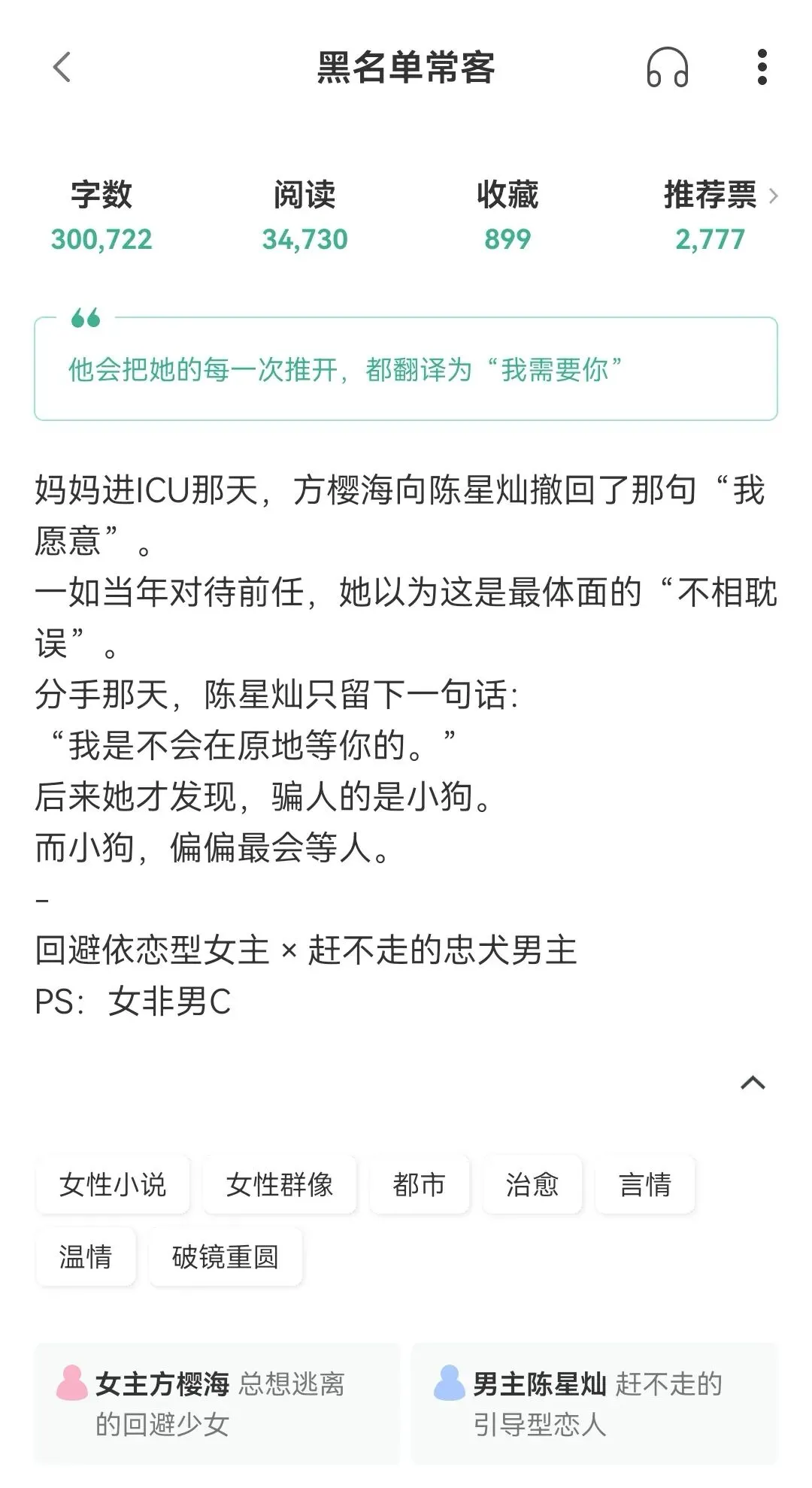 收藏了好久的文完结了,熬夜看完,不得不说还是很了解我自己的哈哈哈哈,果然很喜欢很适合呢。回避型女主与恋爱脑男主,感觉大大真的好懂呀,很细腻的文字,非常让人治愈