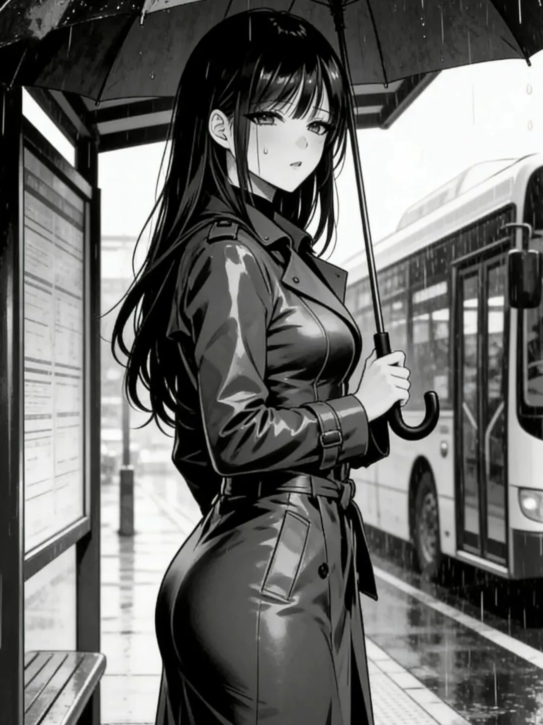 黑色风衣被雨水打湿,勾勒出利落的轮廓。她撑着伞站在站牌下,长发如瀑,眼神却像结了霜的湖面。公交车一辆辆驶过,她始终没有上车。
