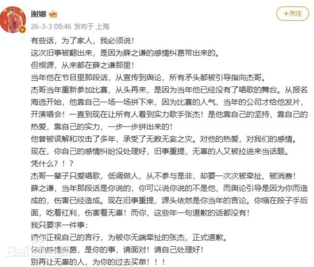 之所以再起波澜,是因为谢娜在微博上霸气护夫:“请你(薛之谦)正视自己的言行,为被你无端牵扯的张杰,正式道歉。”