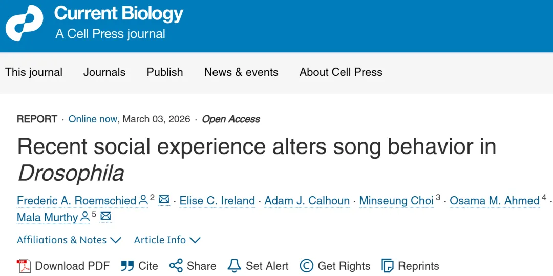 论文信息: 标题:Recent social experience alters song behavior in Drosophila 期刊:Current Biology (2026-3-3) DOI:https://doi.org/10.1016/j.cub.2026.02.003