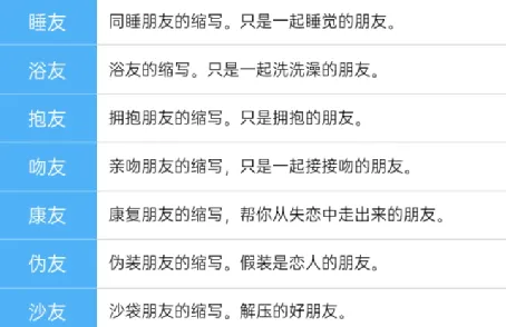 比如“抱友”,即只拥抱,不发生越轨行为的男女;再比如“睡友”,即能一起睡觉,但要保持纯洁的情感关系。