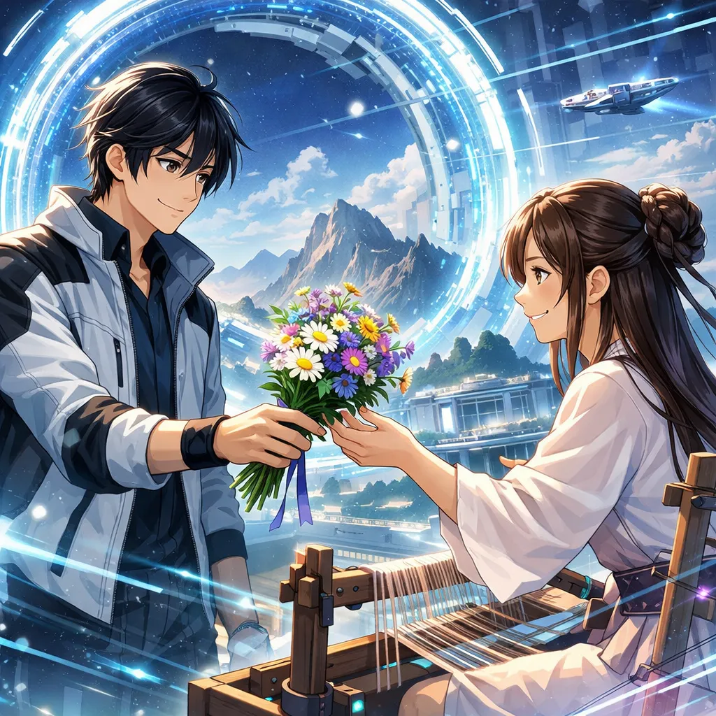 手里捧着一束野花,黄的白的,插在一个粗陶罐子里。