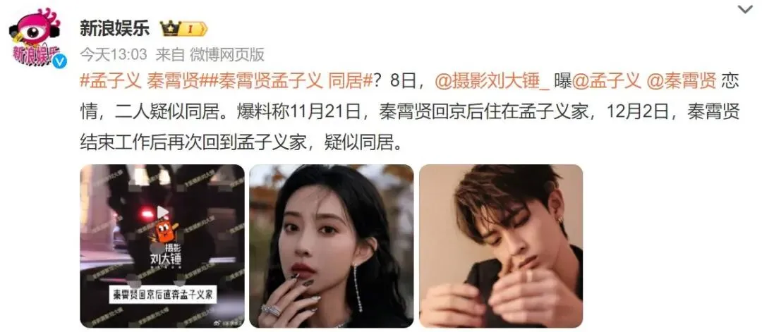 狗仔爆料,秦霄贤分别于11月21日和12月2日住在孟子义北京的家,两人疑似同居。