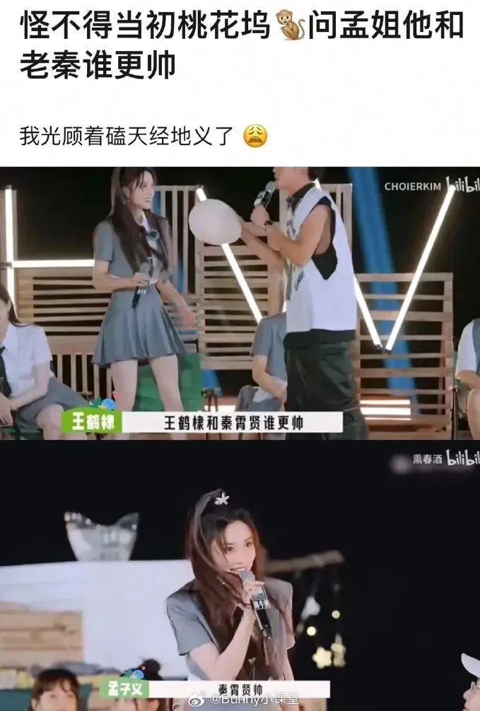 ,估计早就嗅到了恋爱的酸臭味,在桃花坞节目里直接问孟子义“王鹤棣和秦霄贤谁更帅”,而孟子义也偏心地回答“秦霄贤帅!”