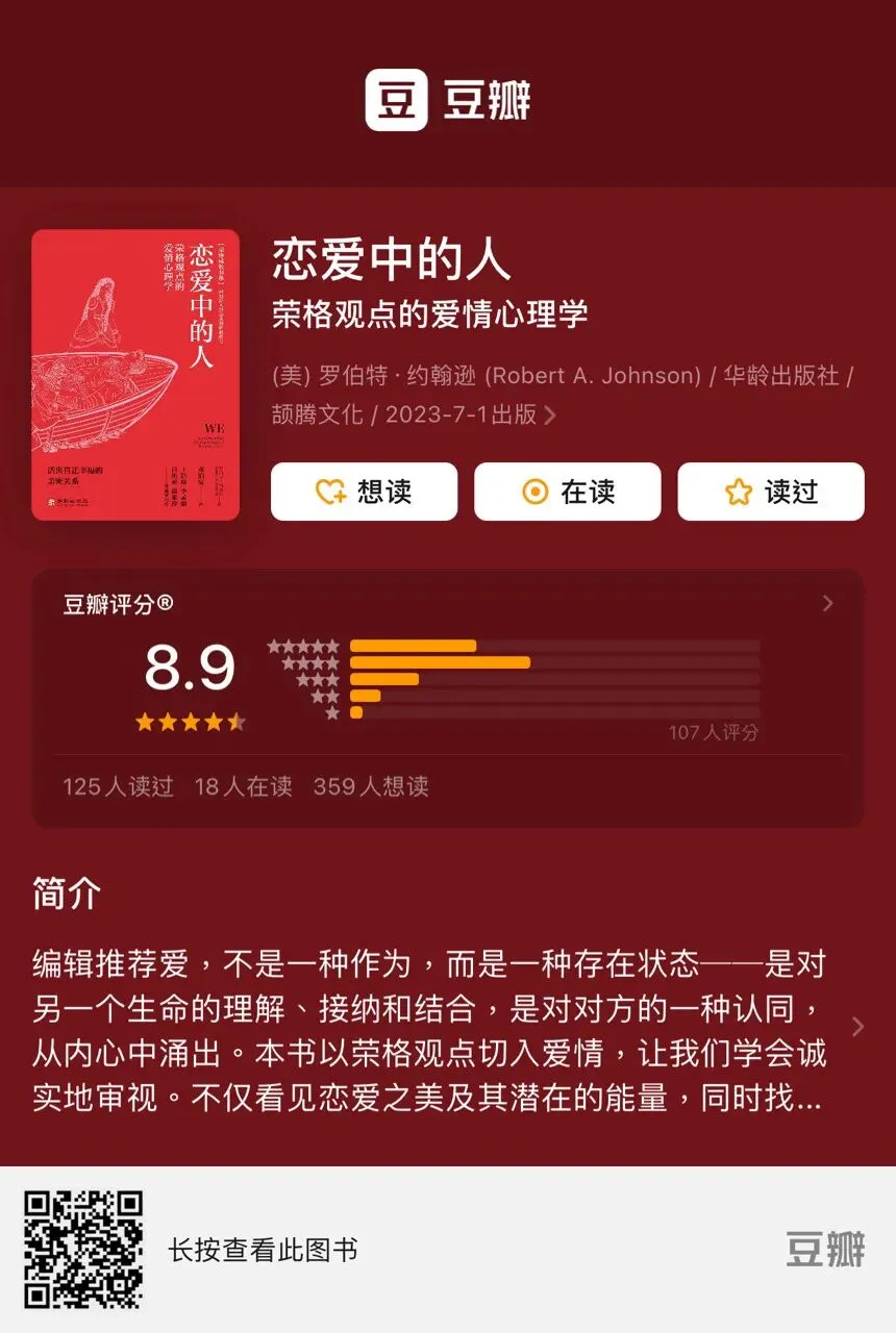 诚实地审视恋爱,无论男女,都是一趟需要勇气的旅程,强迫我们不仅要审视恋爱之美及其潜在的能量,同时审视我们内在无意识层面的矛盾与幻象。需要勇气的旅程总不免要行经黑暗的幽谷,当面对艰难的冲突时,假如我们坚持下去,必将获得对意识的崭新认识。
