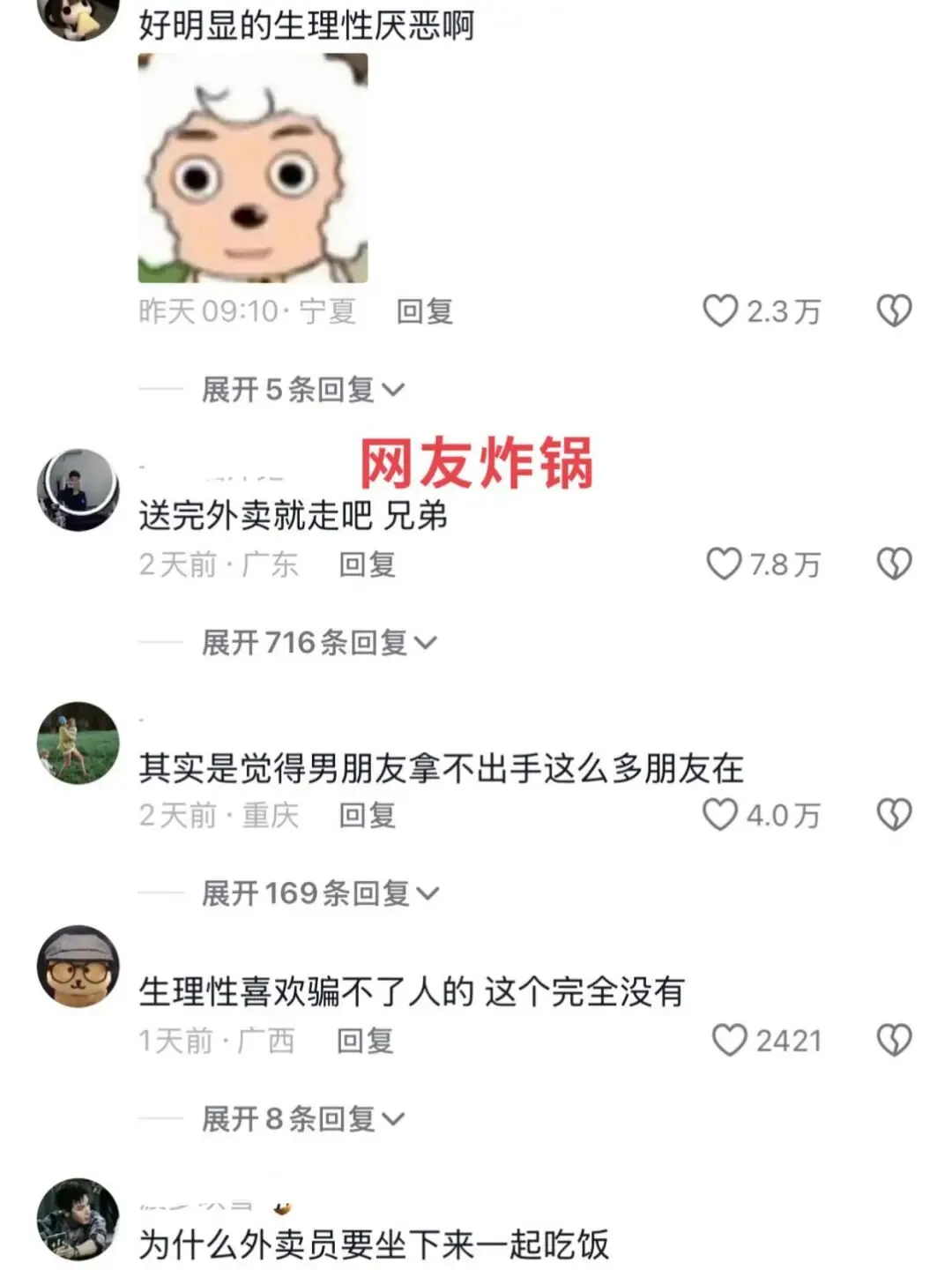 还有人扎心道:“女子一脸不是很熟的样子,都不正眼瞧一下,要多尴尬,就多尴尬,好像在说:你来干嘛?外卖放门口好吗!”