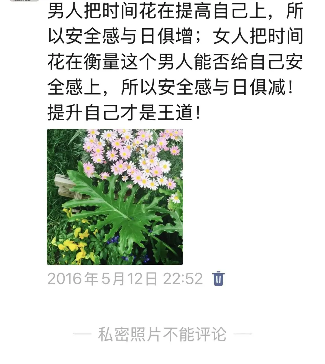 “男人把时间花子啊提高自己上,所以安全感与日俱增;女人把时间花在衡量这个男人能否给自己安全感上,所以安全感与日俱减!提升自己才是王道!”