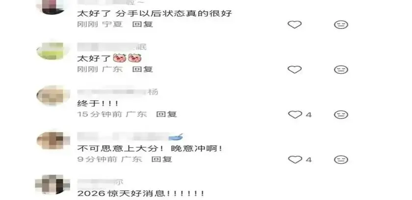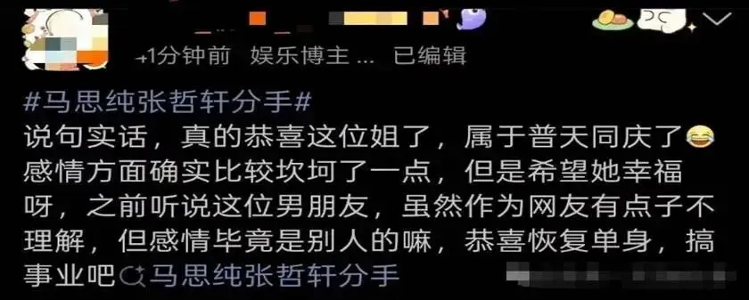 然而与以往明星分手时常见的“惋惜”、“意难平”或对第三者的“挖掘”不同,马思纯评论区呈现出一种整齐划一、欢天喜地的氛围。