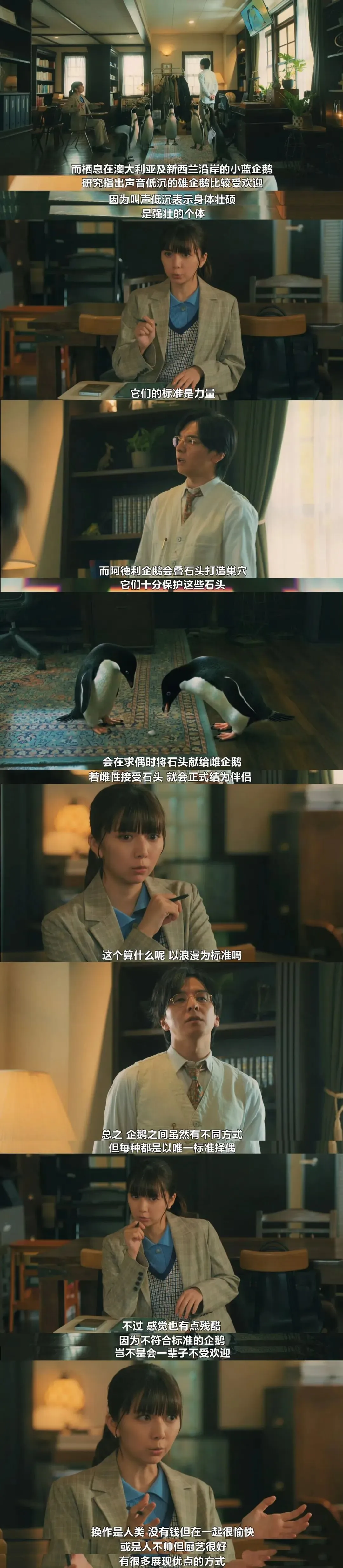 第一集中,就以汉波德企鹅(择偶看领地=人类经济实力)、小蓝企鹅(偏好低沉叫声=健康体征)、阿德利企鹅(献石求爱=浪漫仪式),引发对"人类择偶标准过于复杂”的反思。