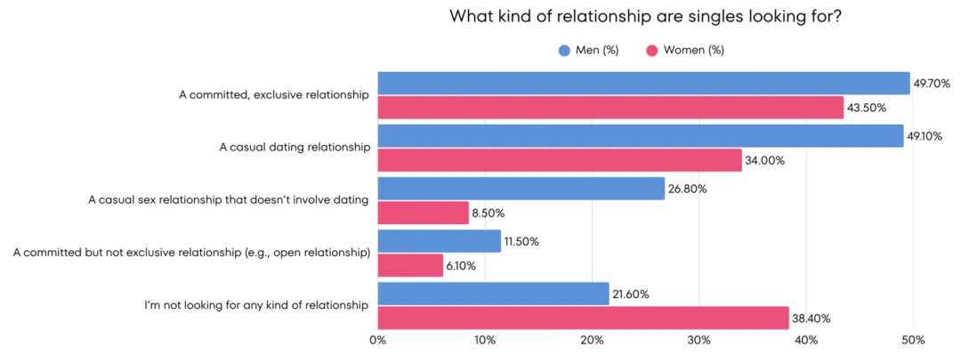 调查显示,近1/5的男性明确表示「目前没有寻找任何恋爱关系的打算」,而这一比例在女性群体中高达1/3以上,女性不想恋爱的比例几乎是男性的2倍。