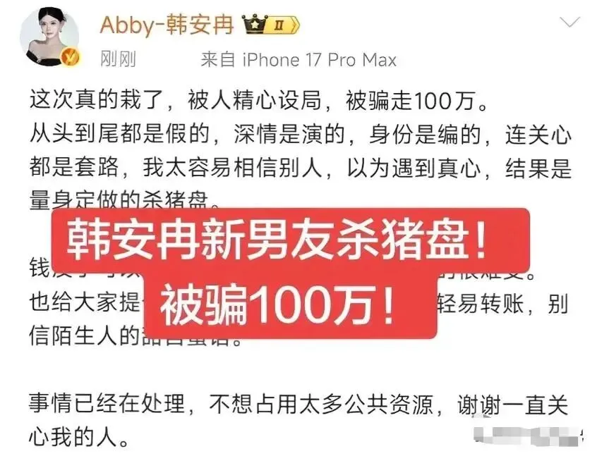不到两周前,韩安冉在直播间红着眼眶讲述自己被"杀猪盘"骗走100万的经历。那叫一个惨啊:线下见面仅4次,前前后后转账+送奢侈品,总损失超100万。