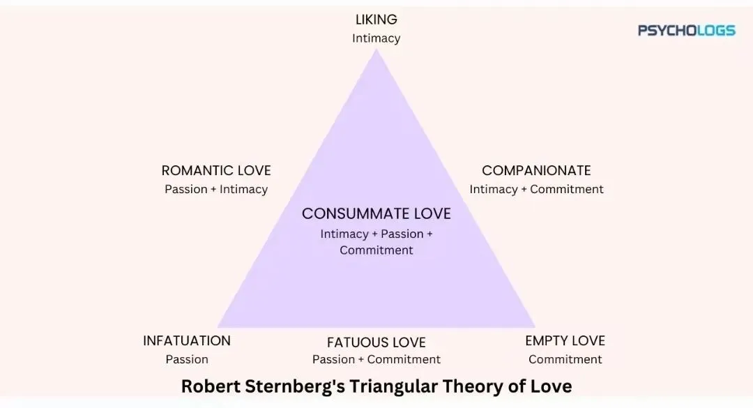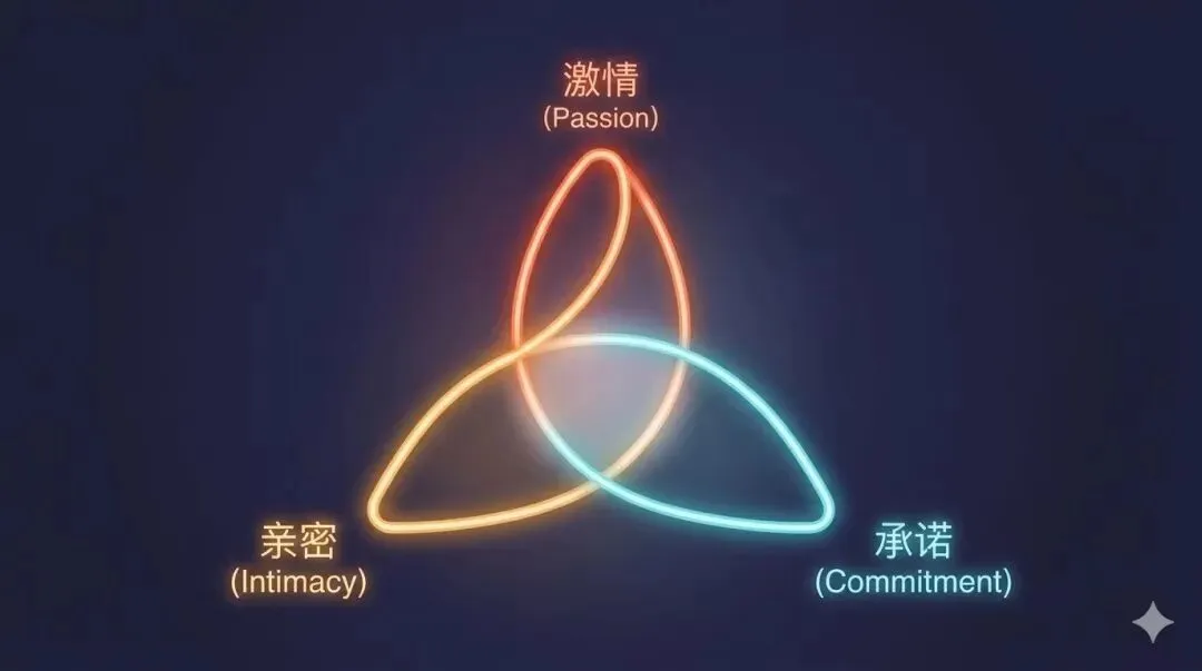 据《半月谈》2025年第10期内容,许多学生更在意学业,将爱情视为锦上添花而不是刚需。一些受访学生坦言,随着恋爱类网络游戏、付费陪聊及“虚拟恋人”等迅速兴起,“没有恋人并不妨碍我拥有爱情”,每个月只要付出少量金钱,就能获得自己想要的陪伴和慰藉。[5]真人线下恋爱的减少,反映了其当下面临的诸多问题。由以上现实因素和背景知识,可以分析大学生在恋爱关系中常见的具体困扰,并运用心理学理论探究其背后的原因。2.1 激情、亲密与承诺的失衡