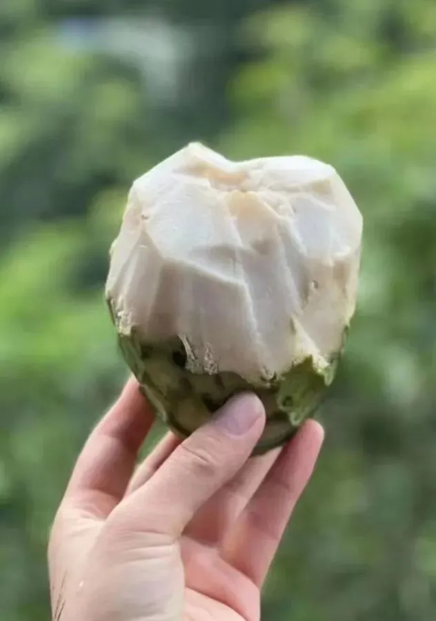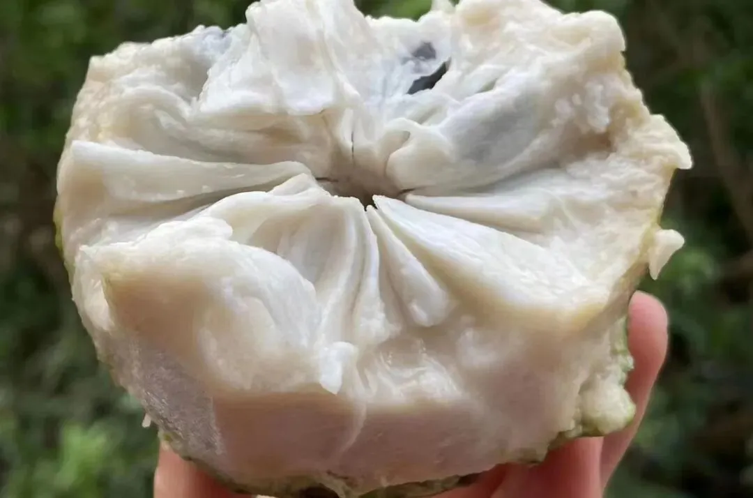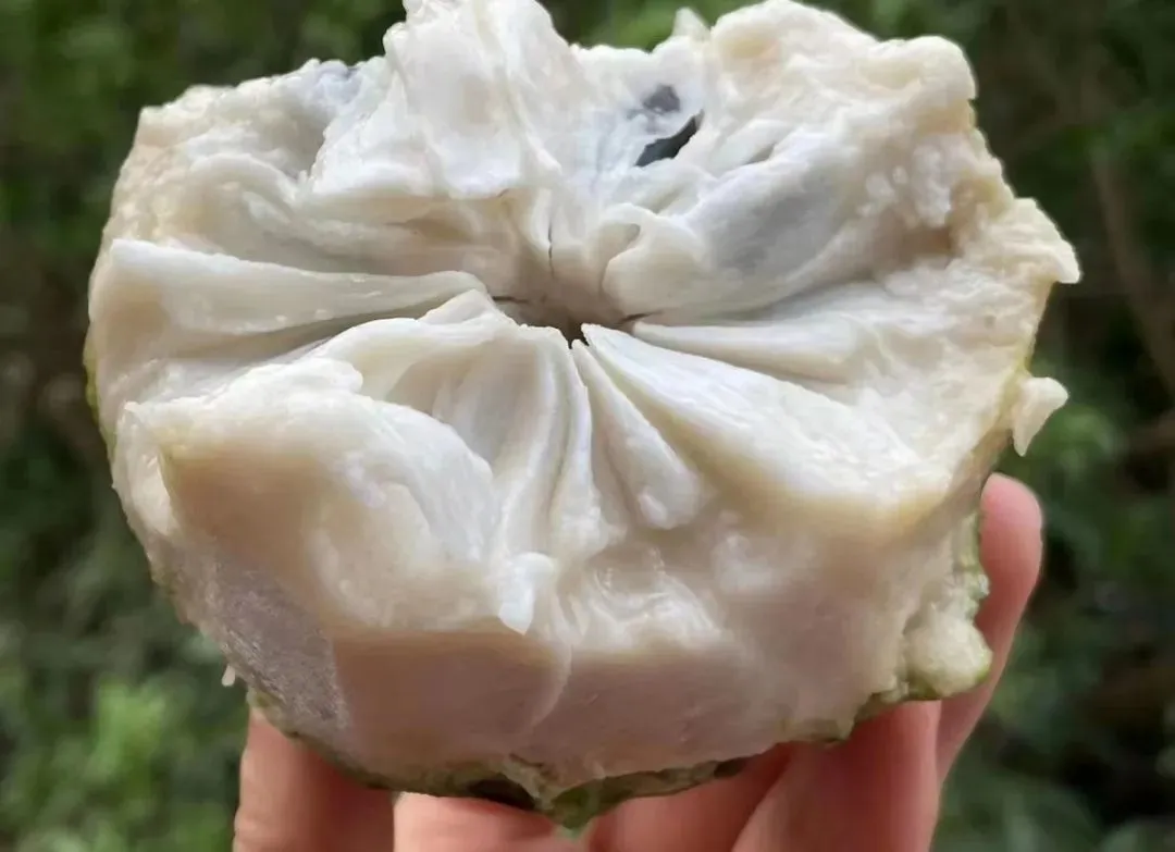 轻轻拨开绿色的外皮,露出白色绵蜜的果肉