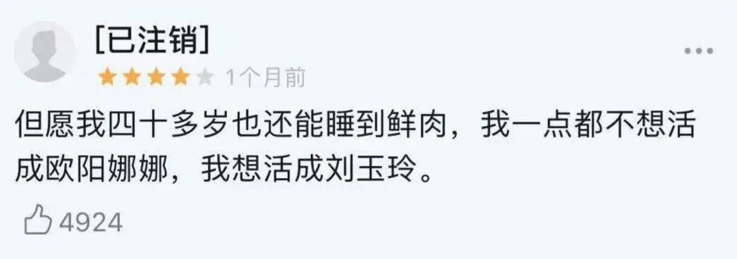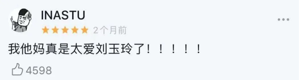 最后,男孩去找自己的人生了,刘玉玲也有了新的情人。而今,她在《致命女人》中,强大、自信、嚣张,完全掌控自己的人生。今年 5 月份刘玉玲还在好莱坞星光大道留了名,是继黄柳霜、李小龙、成龙第四位华人明星。所以她努力工作存钱,给自己建立了一个“fuck you money”基金。当你和老板闹翻,或者不想工作时,可以潇洒地说一句:去你的。她这样的爽剧人生,爽得更踏实。而且没准儿,我们也能过得上。比如 2000 年《霹雳娇娃》里演的女杀手。网友说:“刘玉玲这气场,一看就是一个天生要做老大的女人”。