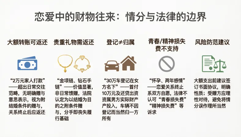恋爱本是美好的事情,财物往来本是情分的体现,但一旦涉及大额支出,最好保持清醒的头脑。对于赠与方来说,大额付出前要谨慎,若以结婚为目的,可签订书面协议,明确财物的性质;对于受赠方来说,别心安理得地接受对方的大额付出,没有付出的索取,终究会面临法律的考验。