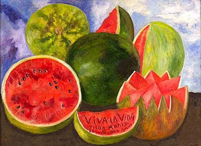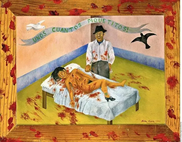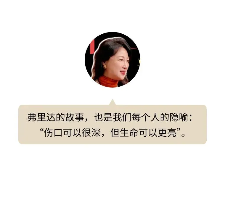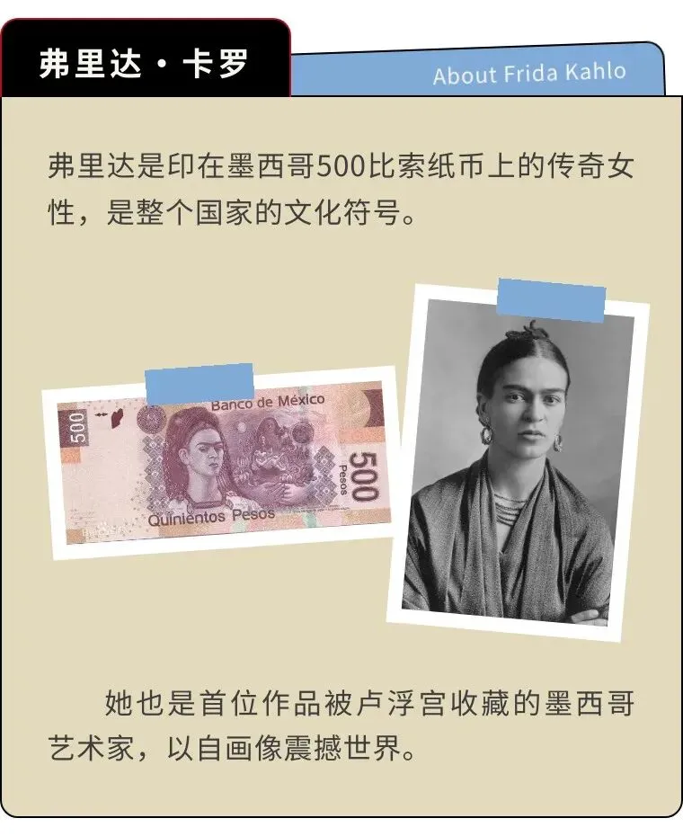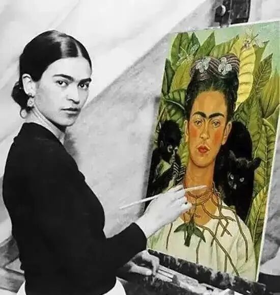 弗里达的一生留下200多幅作品,其中三分之二都是自画像,画中她永远带着极具辨识度的一字眉。在艺术家当中,自画像比例能够如此之大的恐怕是少之又少,可能会有人觉得弗里达是不是有些自恋呢?但是如果你知道弗里达的人生经历,你就会明白这不是自恋,这是自救。七岁时她患上小儿麻痹症,右腿萎缩;18岁遭遇严重车祸,金属扶手刺穿身体,脊椎断成三截,盆骨开裂,右腿十一处骨折。弗里达电影车祸片段,《弗里达》,上映时间2002年此后三十年里,她经历了32次手术,最终右腿被截肢。但弗里达的画作里从没有哭泣的模样,即便画中身体被钉子刺穿、脊柱破损,她依旧脊背挺直、目光坚定。在《亨利·福特医院》里,她坦然呈现流产的血迹,将最私密的痛苦,转化为最公开的艺术宣言。她用画笔告诉世界,疼痛不必是呻吟,也可以是创作。迭戈·里维拉是墨西哥国宝级壁画家,比弗里达年长二十余岁,以老师的身份将她带入艺术殿堂。两人因艺术相互吸引、不顾一切结合,被弗里达父母形容为“大象与鸽子的结合”。可里维拉的风流成性,让弗里达深陷痛苦。1935年,他甚至出轨弗里达的亲妹妹。至亲与挚爱带来的双重背叛,将她推入深渊。弗里达拿起画笔创作《只是掐了几小下》宣泄愤怒,随后她剪去长发决意不再爱他,可是心理上却始终无法割舍。离婚后,她画出《两个弗里达》,以扭曲的画面诉说内心的撕裂;为了报复里维拉,弗里达也开始四处留情,最有名的就是摄影师尼古拉斯·穆雷,我们现在看到的大多数弗里达的照片都是他拍的。但是最终她还是选择与里维拉复婚,里维拉也陪伴她走到生命尽头。这对相爱相杀一生的夫妻,如今被印在同一张500比索纸币的正反两面,生前纠缠,死后相依,再不分离。墨西哥500比索的正面(右下↘️)和反面(左上↖️)毕加索曾对里维拉说:“不管是我还是你,都画不出弗里达这么好的自画像。”向来极少夸赞他人的毕加索,却给予了弗里达极高的认可。弗里达画的是自己,却超越了个人,她标志性的一字眉、唇上细须、满头鲜花,不仅成为个人符号,更成为墨西哥的文化象征。1954年,自知时日无多的弗里达,在生命最后一年画下七个西瓜,翠绿的瓜皮上写着“Viva la Vida”——生命万岁。这个被痛苦折磨一生的女人,在生命终点没有怨恨,没有自怜,唯有坦荡地向生命致敬。回顾弗里达的一生,是一场漫长的对抗:她对抗破碎的身体,将紧身衣化作艺术;对抗背叛的爱情,将心碎化为传世名作;对抗注定的死亡,在最后时刻高声礼赞生命。弗里达•卡罗,《希望之树,不要失去勇气》,1946她让世人明白,伤口不是终点,而是起点,她把疼痛变成杰作,把苦难活成传奇。艺术家的不幸,往往是艺术的大幸,我们永远记得那张独特而坚韧的面孔,记得那个在苦难中依然高呼“生命万岁”的灵魂。