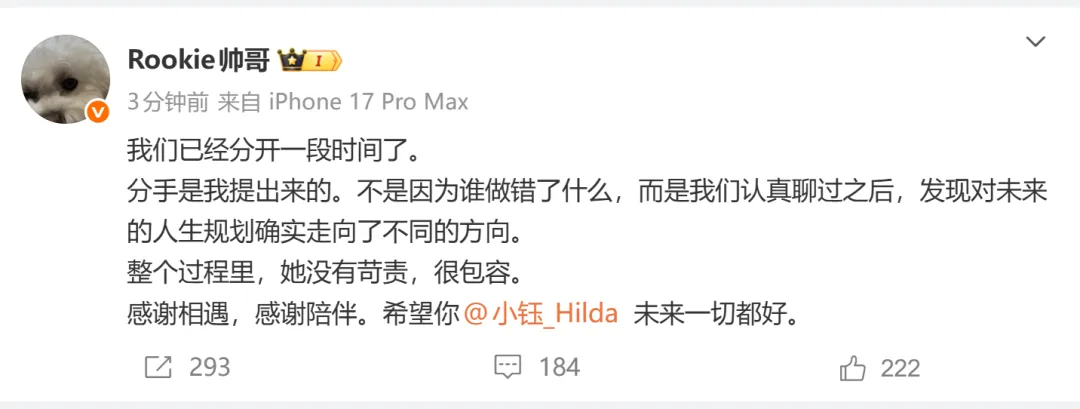 Rookie在自己的声明中表示,分手由自己提出,并非双方有过错,核心原因是两人认真沟通后,发现对未来的人生规划走向不同。他还提到,整个过程中小钰始终保持包容,没有苛责,并向小钰表达感谢与祝福。
