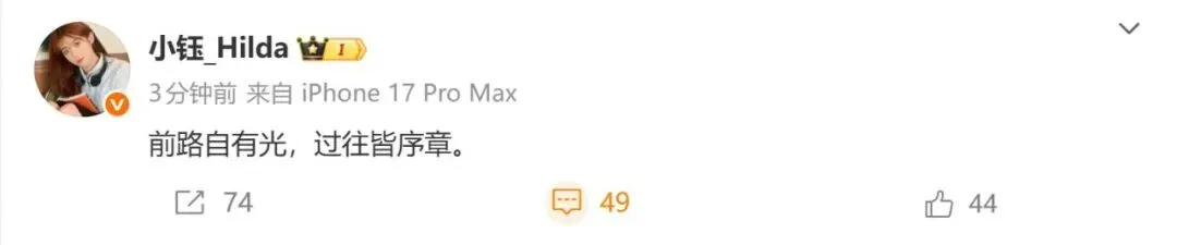 小钰在自己所发的动态里只写了一段话:前路自有光,过往皆序章。
