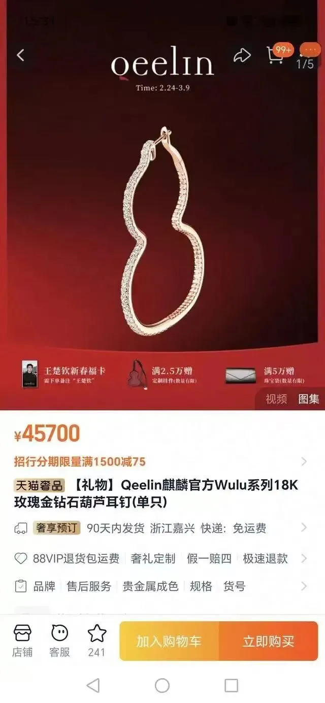 是,这个耳环和普通耳环不一样,单只就要四万+,一对九万,赶上普通人一年的工资了。