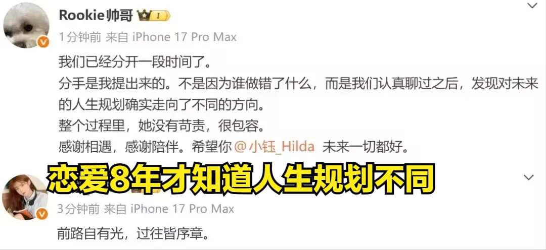 所以当Rookie自己出来确认,说俩人已经分手一段时间,原因是人生规划不同时,很多粉丝,尤其是小钰的粉丝,直接就破防了。不是,兄弟,你这规划早干嘛去了?谈了八年你才想起来规划不同?这理由听起来多少有点敷衍,感觉像是把人家姑娘最好的青春都给 规划 进去了,最后轻飘飘一句话就画上句号,也难怪有人意难平。