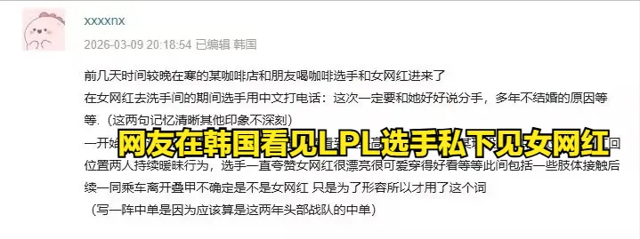 本来嘛,感情的事分分合合也正常,但这事之所以能炸成这样,还因为有个 前情提要。就在Rookie官宣分手的消息冲上热搜之前,网上就有一个匿名的爆料贴被挖了出来,现在看简直是 神预言。帖子大意是说,某个前IG中单,LPL的顶级选手,最近在韩国私下见了女网红,还跟对方用中文交流,并且说自己这次回国就要跟国内的女友提分手,解释这么多年不结婚的原因。