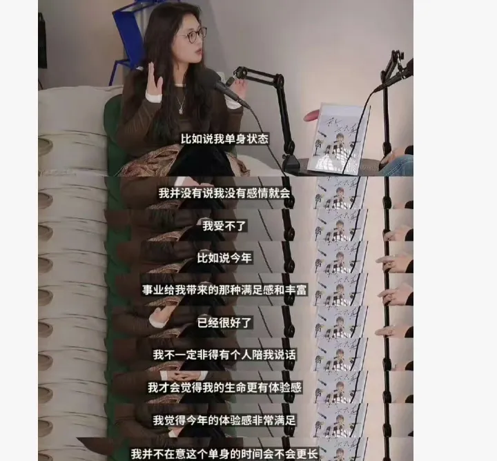 她在杨天真的播客里,大大方方承认自己现在是单身,还笑着说“单身真的挺舒服的,也不是说没感情就活不了”,那种从里到外的松弛感,是装不出来的。