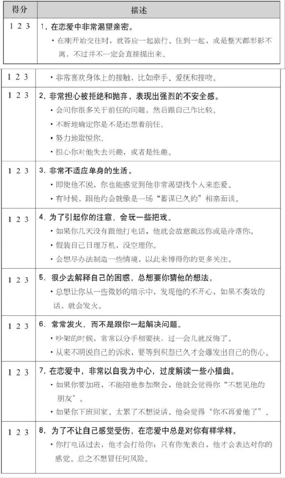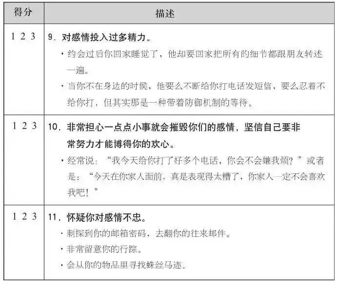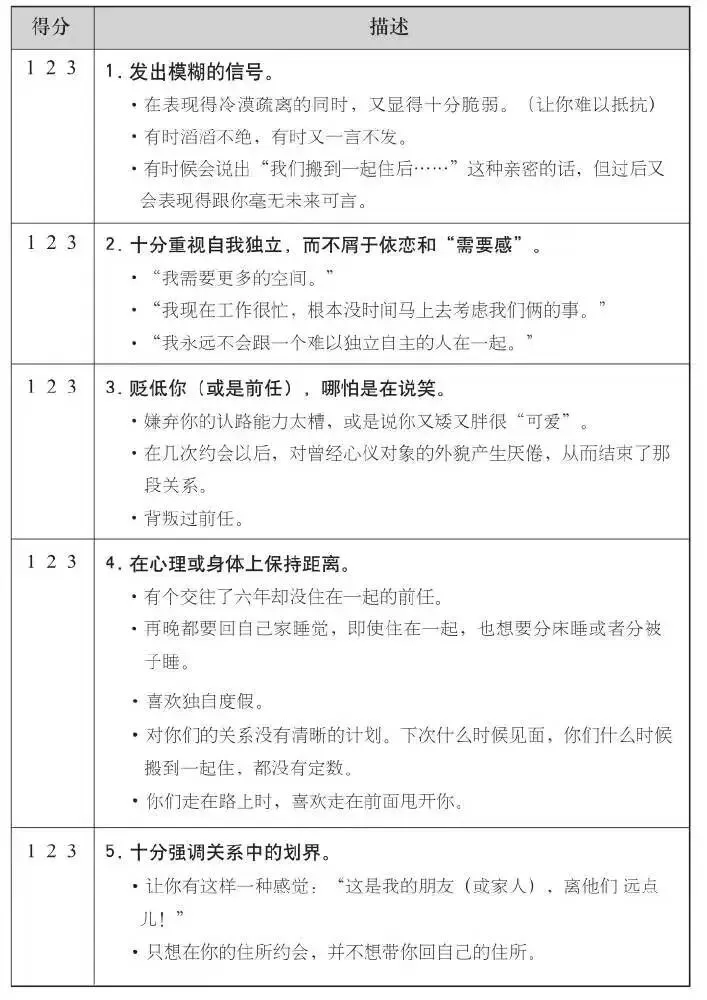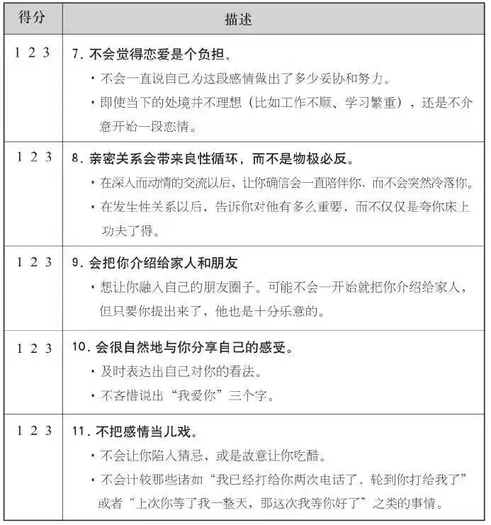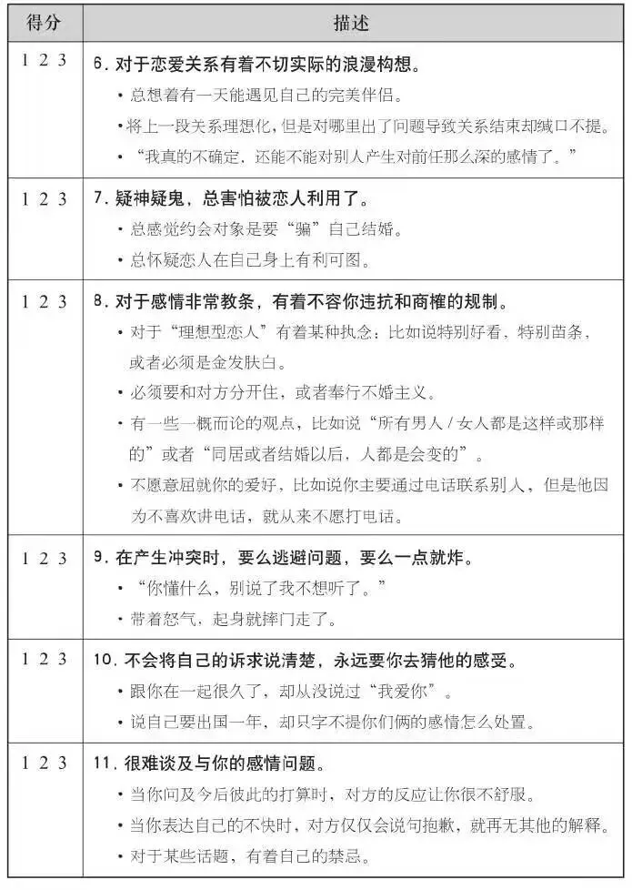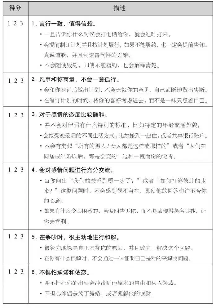 看完每一种特质以后,你要根据日常生活中的交往和对话,来判断伴侣是否符合这种特质。得分越高,就说明对方越符合该种特质,下面是你的记分键: