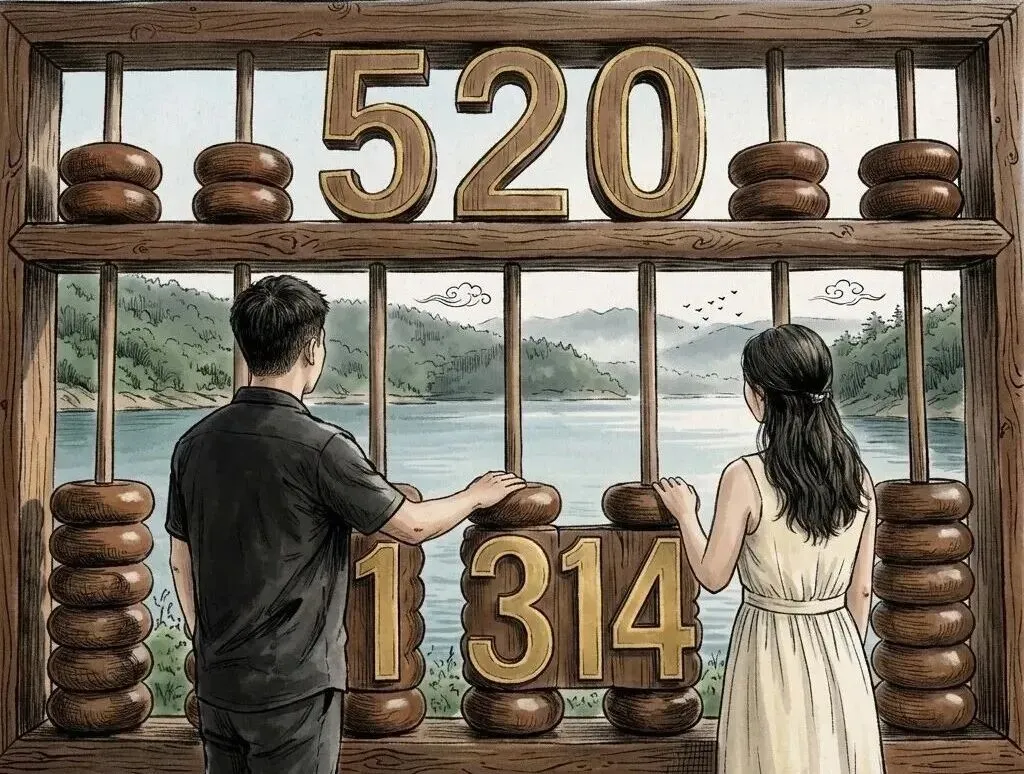 这个网红景观以男女背影为主体,二人并肩站在木质框架前——框架上部刻金色数字“520”,下部刻“1314”,两侧及内部边缘有算盘珠子造型装饰,胡桃木框架+传统算珠形制还原中式美感。背景是山水景色(平静湖水、葱郁山峦、散落云朵间的飞鸟),色调柔和,传递出“执子之手、与子偕老”的静谧感。将“数字情缘”与“山水意境”融合,让爱情像山水一样永恒,堪称“山水为幕、算珠为证”的浪漫史诗。