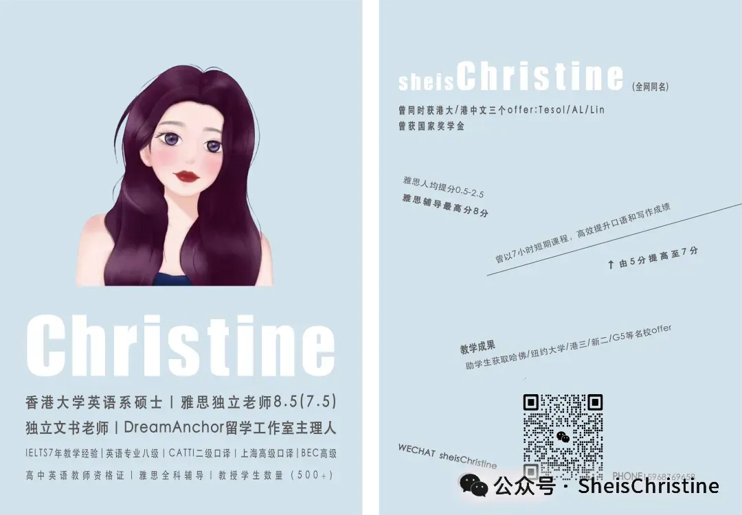 雅思教学(港大英语系/雅思8.5)和留学申请(港三G5新二团队负责)有需可联系微信:SheisChristine