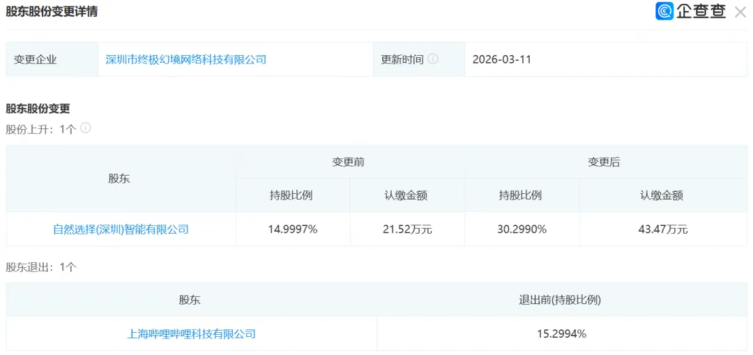 3月10日,深圳终极幻境发生工商变更,B站退出股东行列,退出前占股约15.3%。同时,另一位股东自然选择的持股比例则从15%增至30.3%。