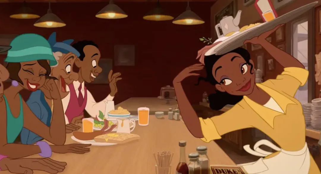 主角蒂安娜,迪士尼第一位黑人公主,也是最不公主的公主。她没有富商父母、没有城堡、没有王冠、没有锦衣玉食、没有魔法,就是一个普通到不能再普通的打工人。别人的梦想是王子与玫瑰,她的梦想只有一个:靠自己开一家餐厅。