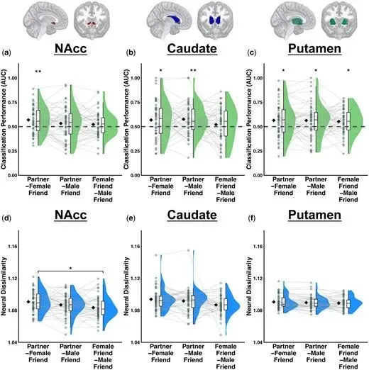 研究发现,当受试者与男性好友的日常互动频率极高时,伏隔核 (NAcc) 区分伴侣与该好友的能力也会下降。这暗示 NAcc 可能也编码了某种通用的“亲密感”或“熟悉度”。