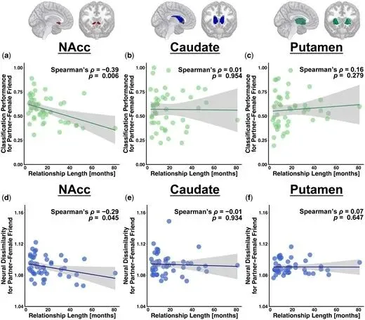 研究者对受试者(恋爱时长从 3 个月到 81 个月不等)进行了探索性相关分析。数据呈现出一个清晰的负相关趋势:随着恋爱关系的持续时间增加,伏隔核中区分“伴侣”与“女性好友”的神经准确率和差异性显著下降。