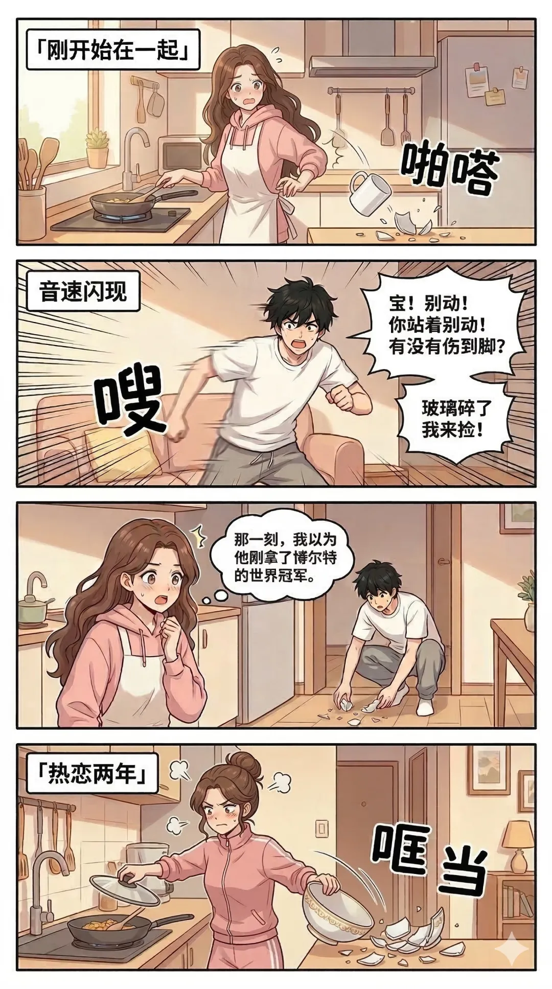 刚开始在一起,打碎个杯子,他像拿了博尔特的世界冠军一样瞬移过来。
