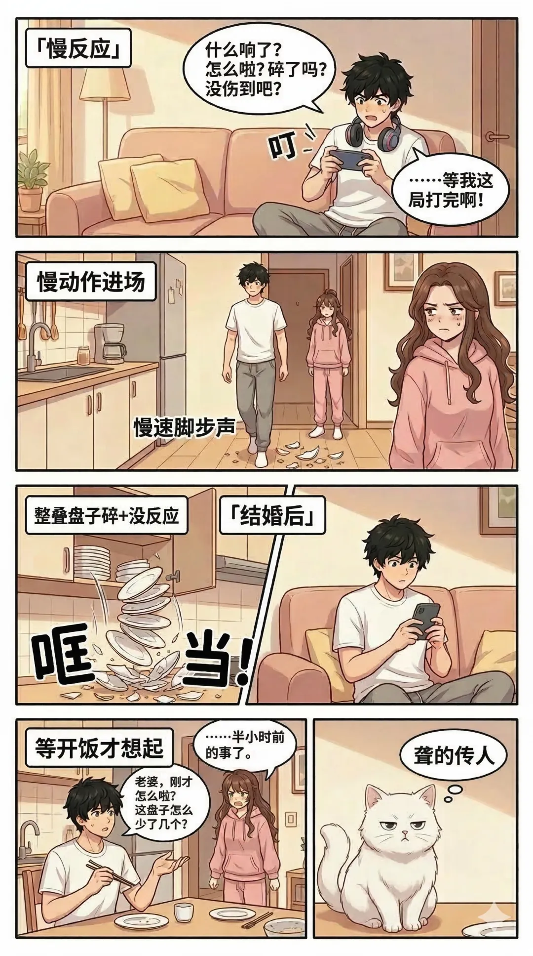 结婚后?打碎整叠盘子,"哐当"一声巨响,他在刷手机完全没反应。等开饭时坐到餐桌前,才突然发现:"老婆,刚才怎么啦?这盘子怎么少了几个?"
