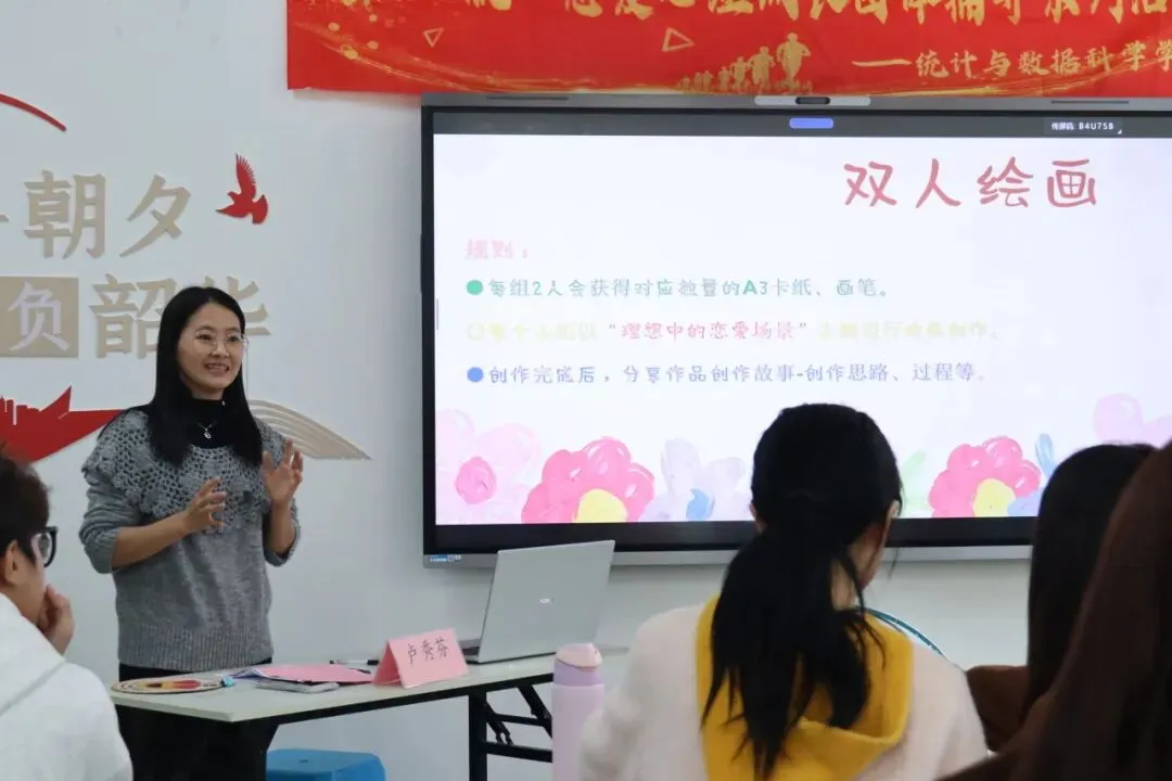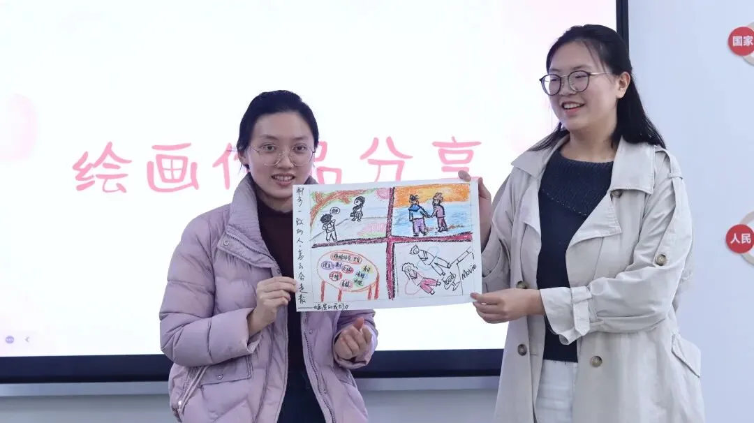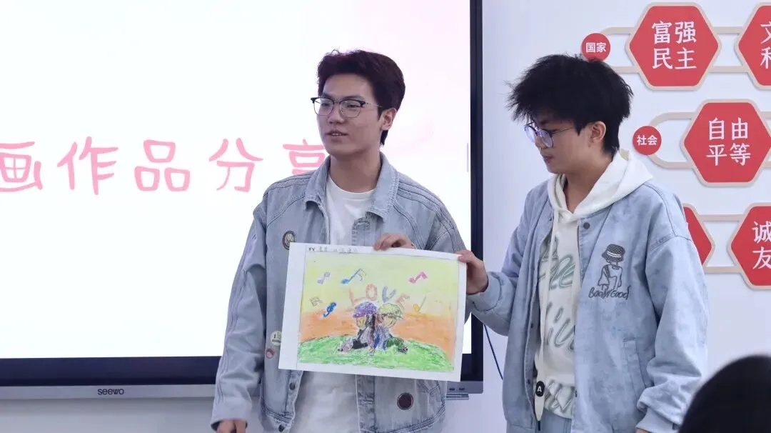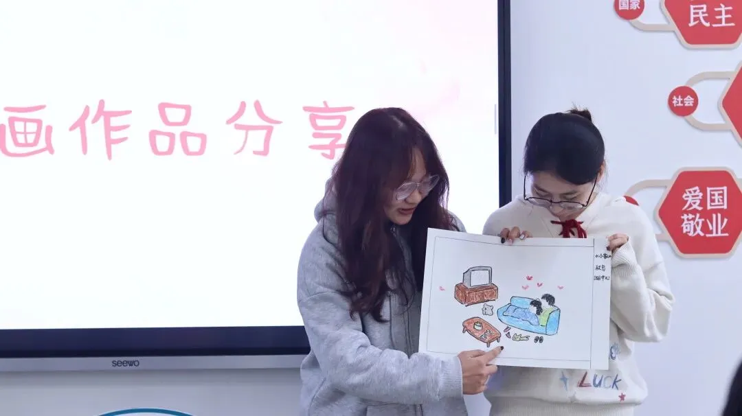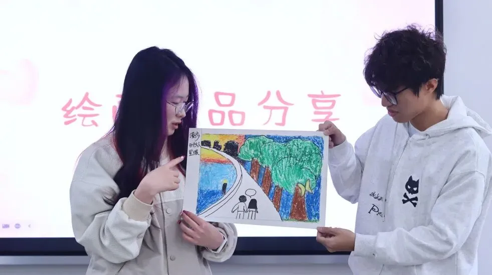 展示环节中,饭后漫步的悠然、晚霞秋千的浪漫、居家相伴的温馨……一幅幅画作生动勾勒出青年学子对美好爱情的憧憬。分享故事里蕴藏的沟通智慧让大家深刻认识到:真正的沟通并非单向表达,而是双向奔赴,是情绪的敏锐觉察、耐心的倾听接纳与彼此的包容理解。