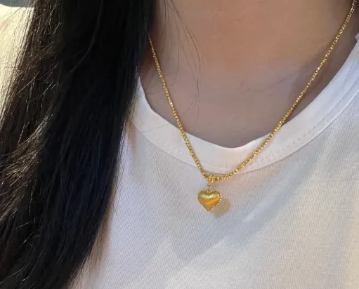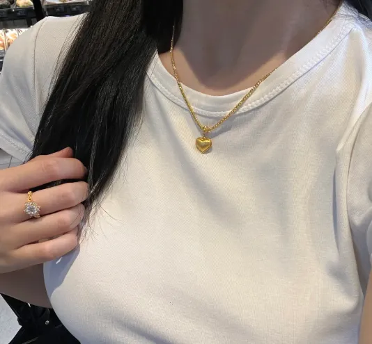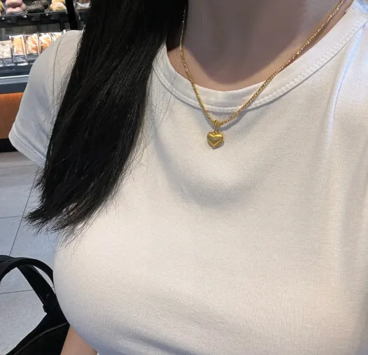我本来以为心形会有点甜过头 结果配白T还挺顺眼 细链不抢镜 坠子是小鼓面 光面打磨得很干净 阳光从地铁口吹上来热乎乎的 我把链子在锁骨上轻轻转了一圈 硬金的感觉是轻却不空 贴着皮肤没有冰冷感 只是在地铁刹车那一下会晃一下 像在点头