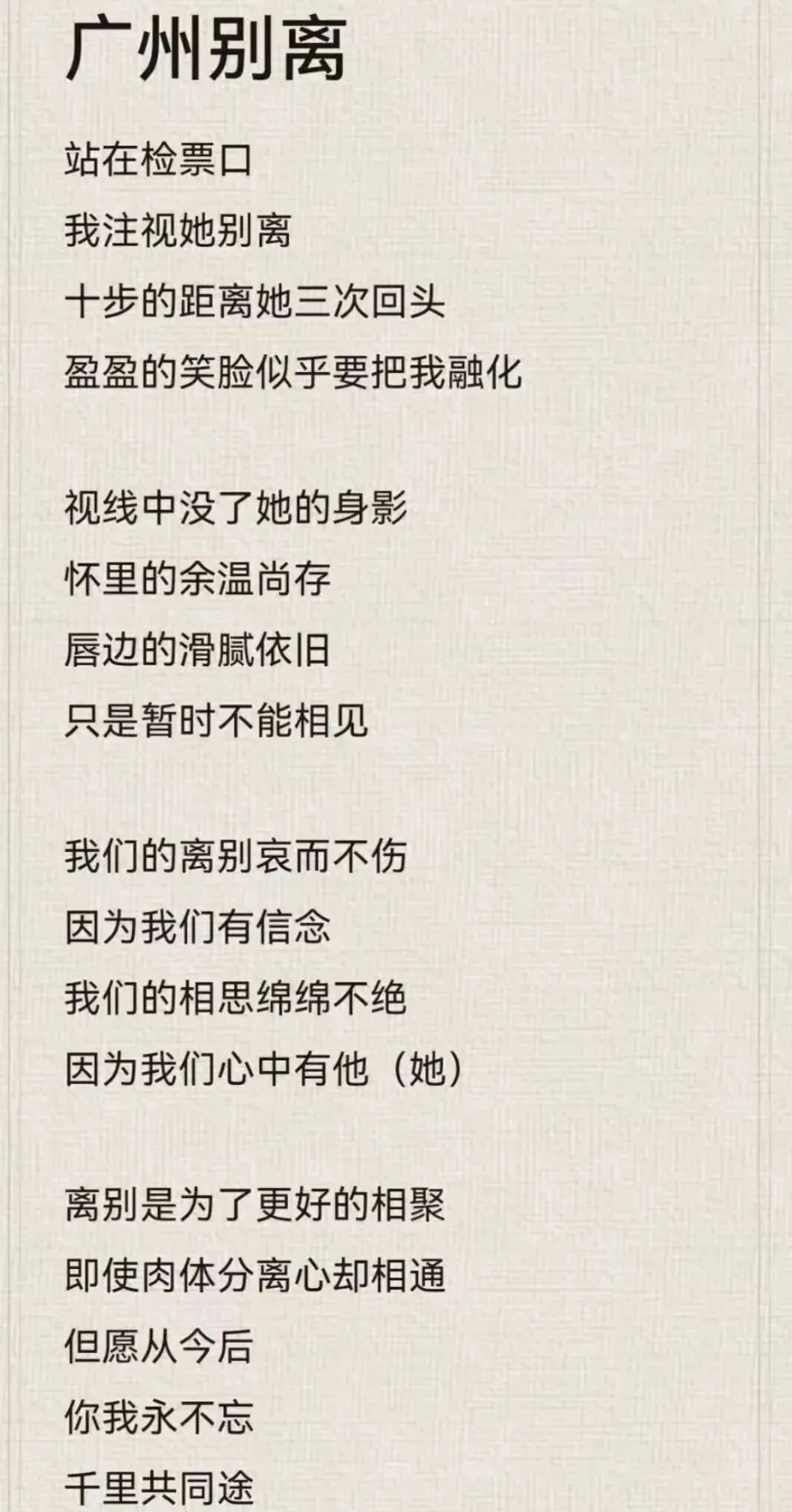 “你我永不忘 / 千里共同途”——既呼应标题“广州别离”,又超越地点,指向永恒。这种“共同途”的信念,是现代人对抗分离焦虑的最温柔武器。