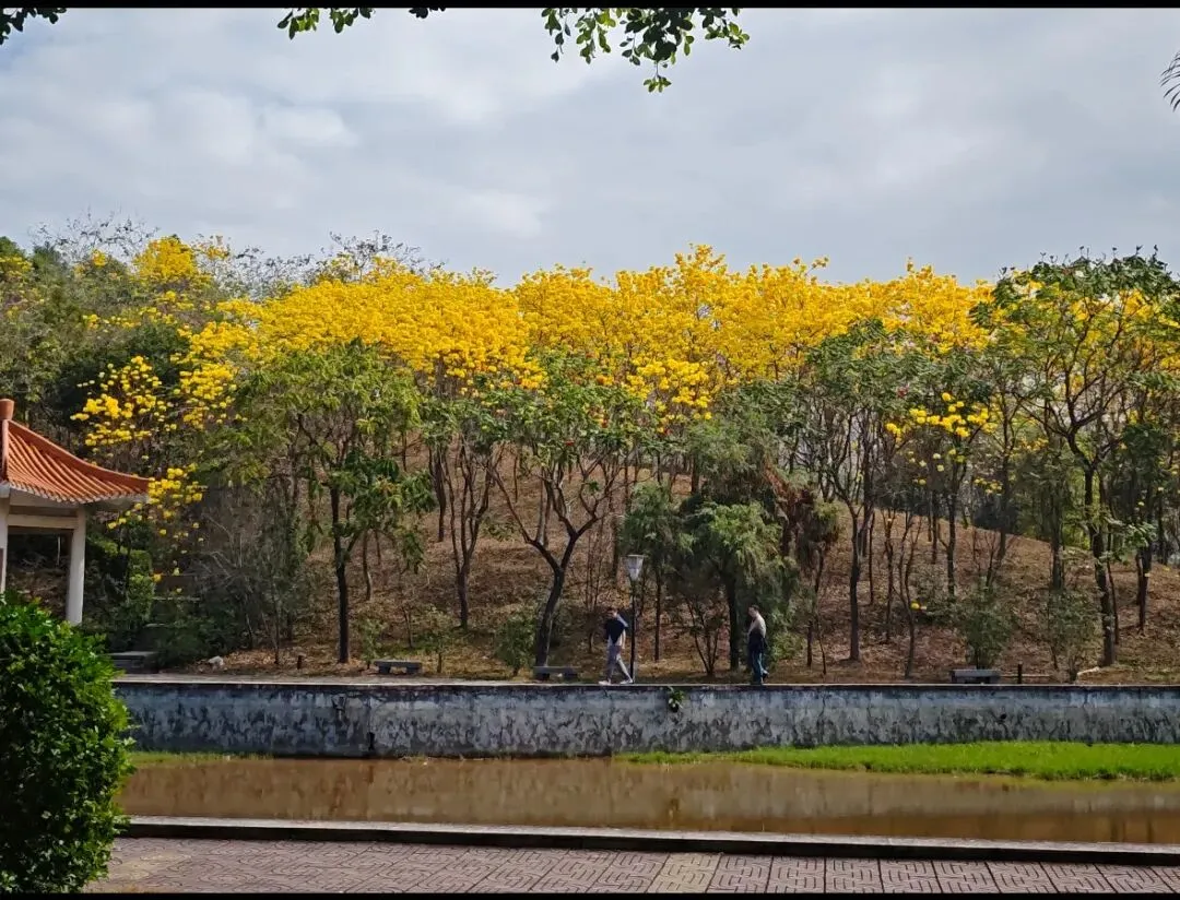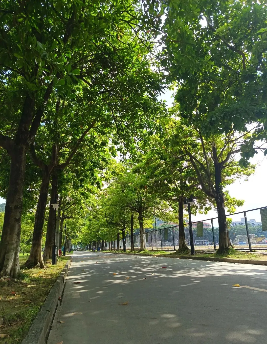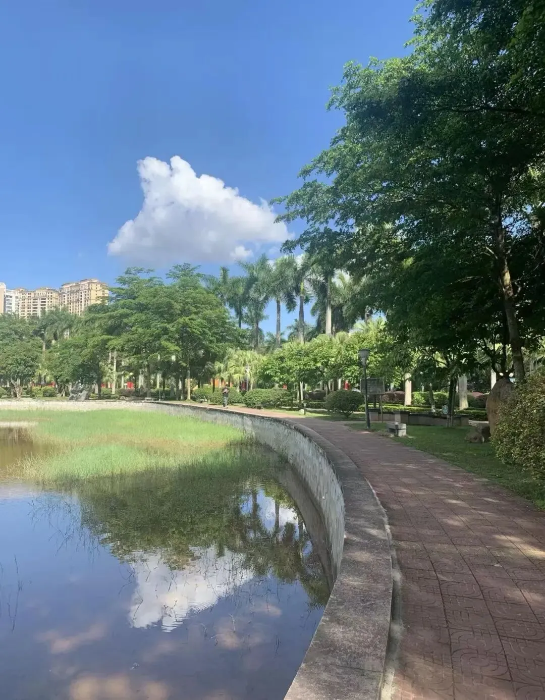我们可以在蓬瀛湖的长椅上看落日余晖,