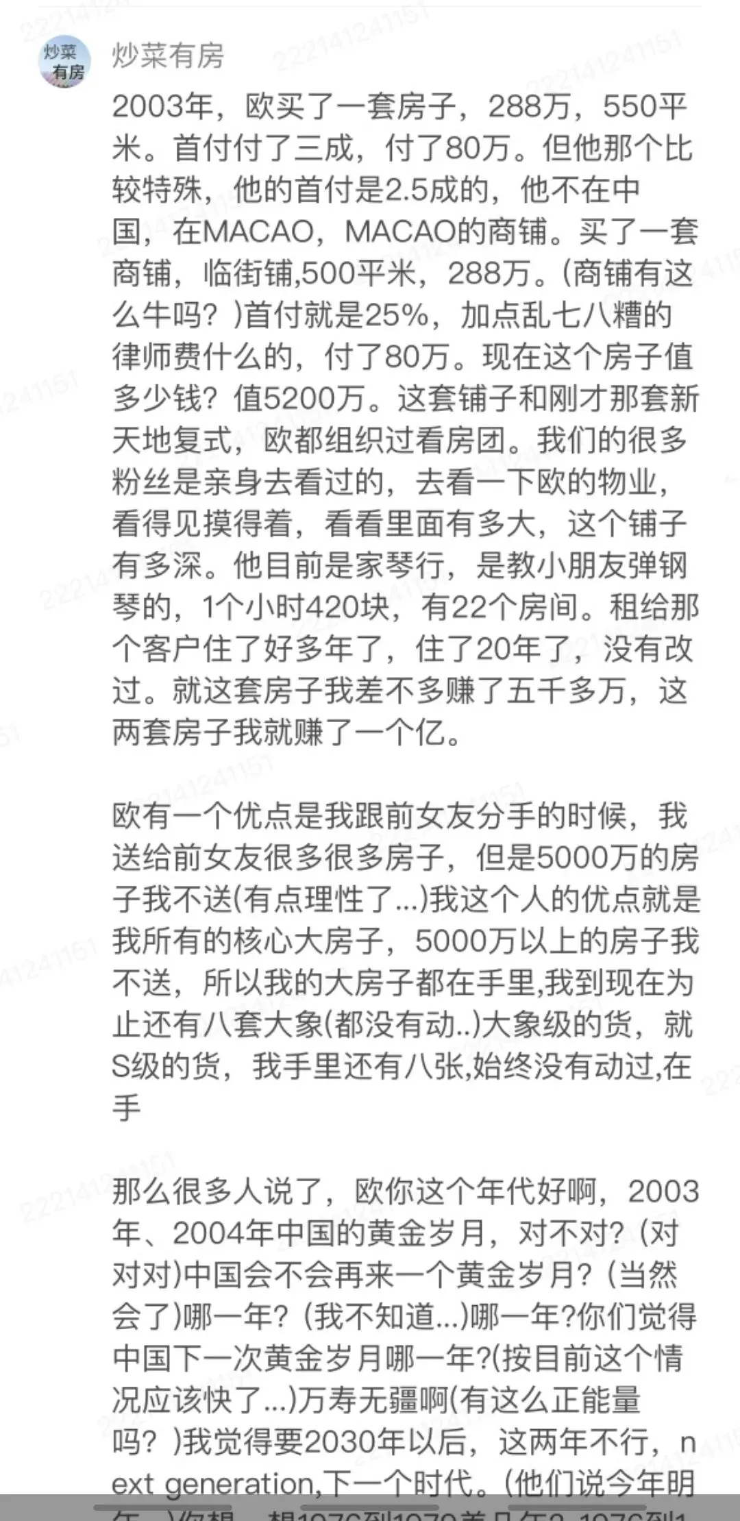 欧老师昨天的直播提了几个案例,欧老师能判断上海新天地和澳门商铺的价值在2003年时候到底是188万还是388万么?
