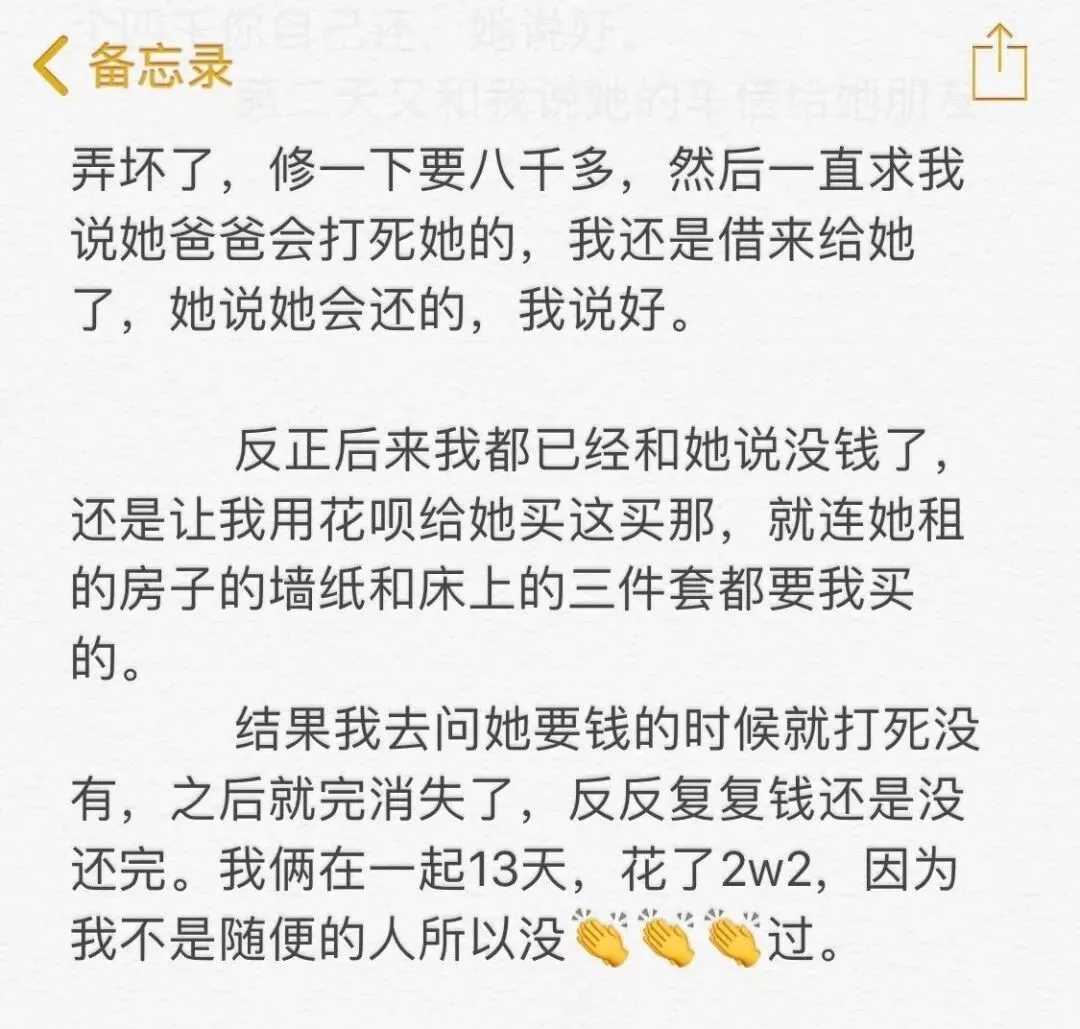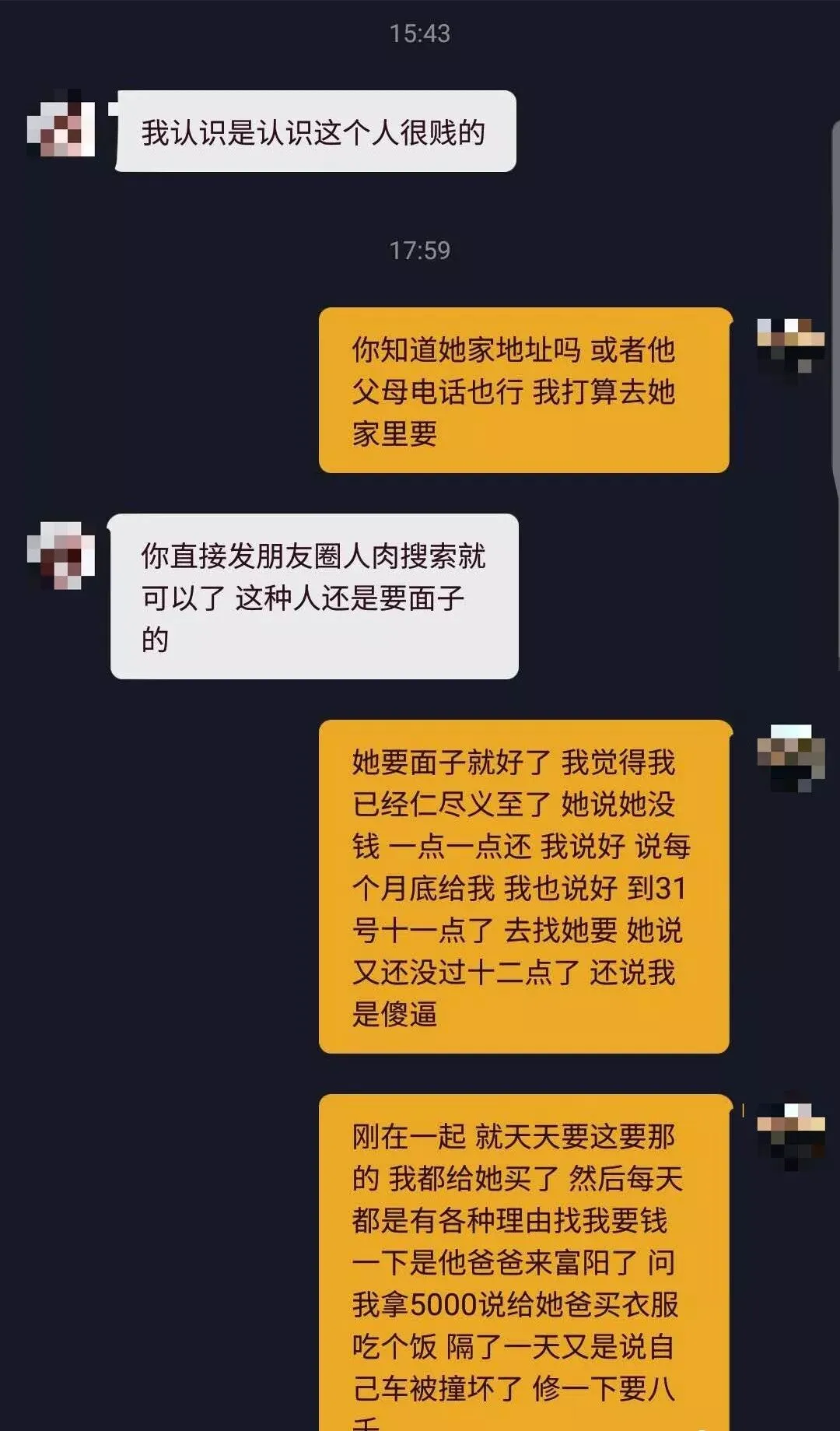 投稿人找到认识女主的人得到以下评价。骗别人的钱去玩鸭子🦆,只要你花的够快,债主就找不到你。