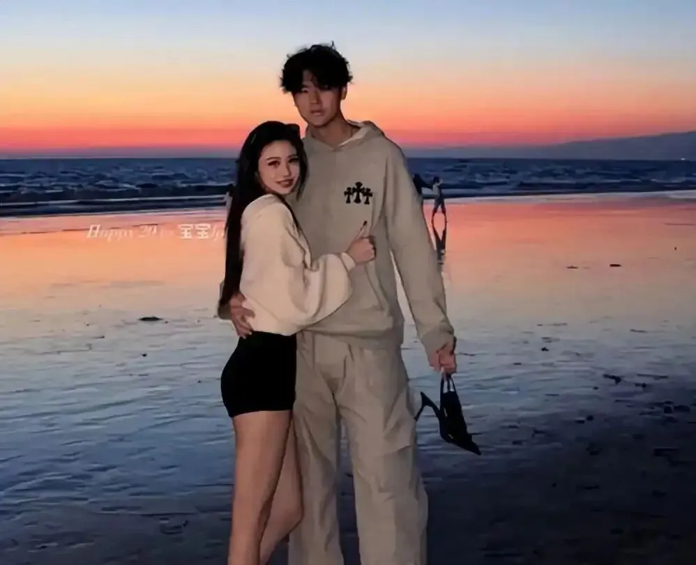 照片里,她靠在一位高个帅气男生的怀里,夕阳洒在海边,男生单手揽着她的腰,另一只手竟然还贴心地替她提着高跟鞋。氛围简直甜到爆。