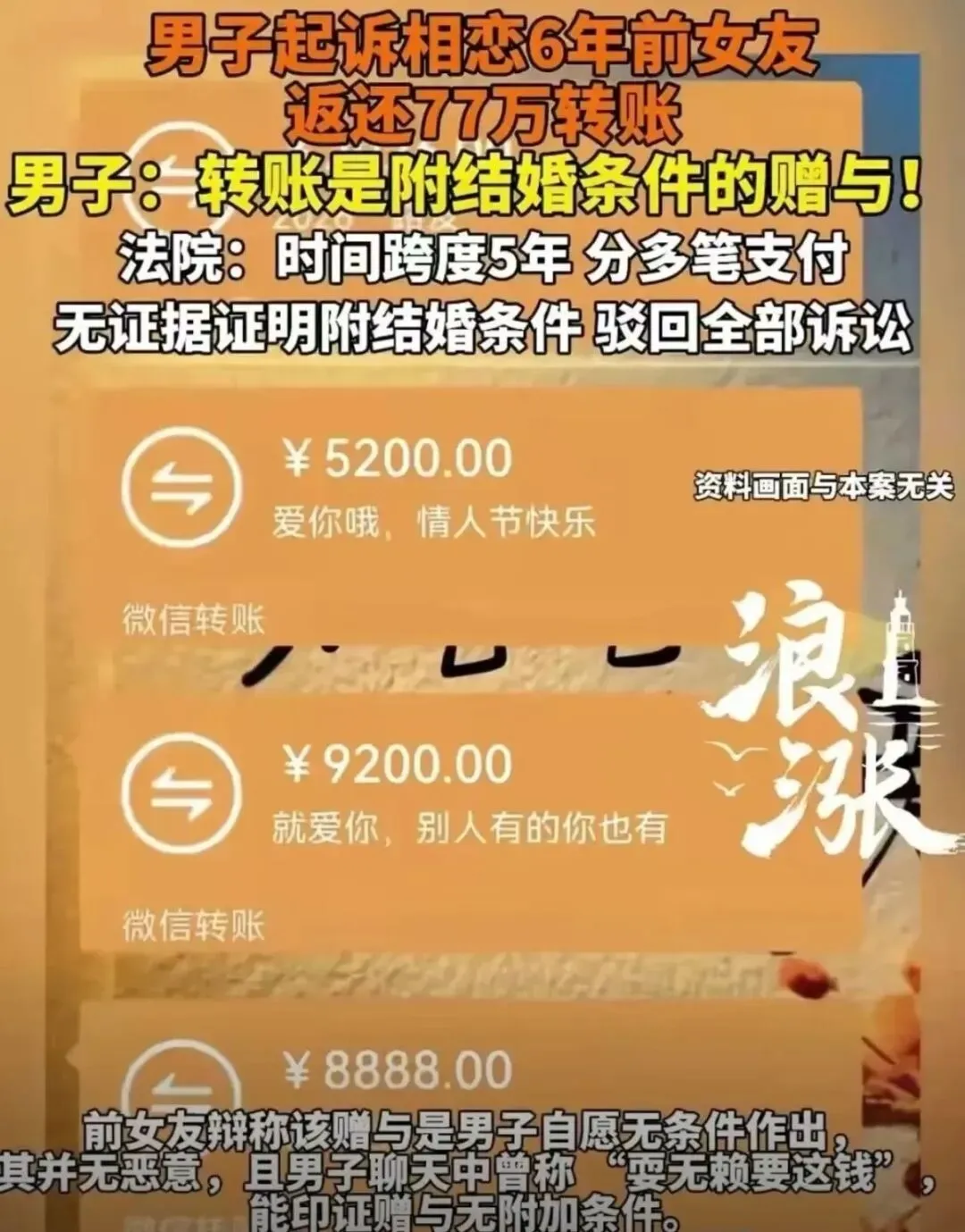 男子在法庭上表示:这77万,是以结婚为目的的附条件赠与,现在婚没结成,钱就必须返还,还要对方承担2万元律师费。
