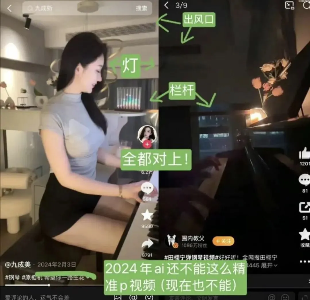九成美24年2月公开的弹钢琴视频,和网上流传的田栩宁弹钢琴视频,室内布局和物件陈设都对得上。