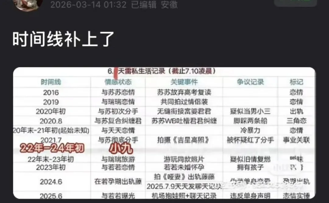 九成美晒的视频里,田栩宁的衣服和造型也能跟他自己发的照片对得上。田栩宁出道以来,时不时被爆出恋情和孩子,什么苏苏若若君君文文😂甚至有网友整理了田栩宁私生活时间线。