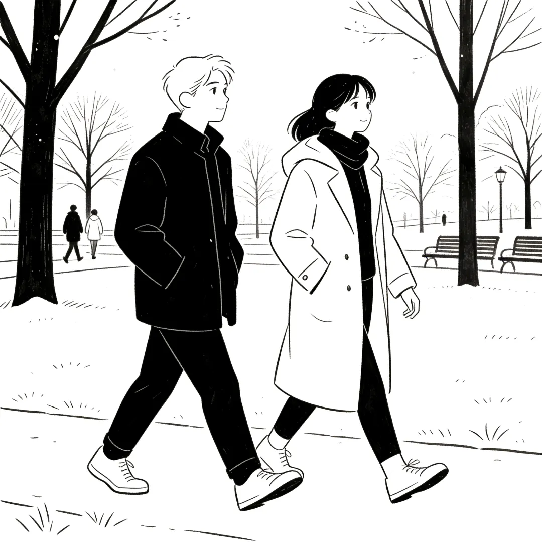 脚踩落叶咔哧作响,像在吃秋天的薯片。风把树叶吹向不同方向,也撩拨着心弦让我慢下来。我把这些分享给他听,他也把见闻说给我。最好的陪伴,就是把琐碎的发现变成两个人的话题。