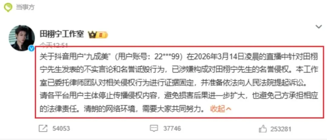 田栩宁再次陷入出轨生子风波,这一次这名女网友直接晒出恋爱视频,这直接让粉丝惊慌,更加让田栩宁不知所措!这名女网友叫“九成美”,是一名高颜值身材好的女网红!女网红在直播间里表示和田栩宁在恋爱期间,他竟然出轨,甚至隐瞒与他人育有子女。这个消息简直是重磅,要知道去年田栩宁因为《逆爱》爆火后,也被人扒出疑似有孩子。当时田栩宁一方发布了一则未婚单身而且没有出轨和生娃的声明,直接让各种声音停职。可是如今,这名女网红直接放出和田栩宁的甜蜜亲吻视频、详细的聊天记录、对得上号的宠物和生活细节,这完全就是打脸田栩宁!从这名女网红的介绍里可以直到他们两人于2022年开始交往,直至2024年1月才分手,这段地下恋情维持了将近两年。但是就在八月份的时候,田栩宁就有了一个孩子,也正是和自己谈恋爱的时候出轨!女网红“九成美”在直播中哽咽地说道,最让她无法接受的,是关于孩子的存在。有的网友表示把前后的事情联系到一起,似乎就能说通了,难怪那个时候田栩宁被拍到有孩子!也有粉丝表示这些视频和照片极有可能是利用了人工智能软件制作而成,所以不一定是真实的。但是有人反驳有这么多的横跨四季、涉及多种生活场景的大量照片和视频,如果全是伪造,其技术难度和成本未免太高了!这个事情让田栩宁直接登上热搜榜,工作室也立刻发文表示这是不实消息,如今已经选择收集证据,毕竟侵犯了名誉权!如今这个事情还没有任何结果,不过两人在一起的视频还在网络上传播!这到底是自编自导还是确有此事,如果是虚假的话,那么这名女网红需要承担法律制裁,这样的代价也太大了。如果真的有此事,那么田栩宁的未来就会遭受打击!