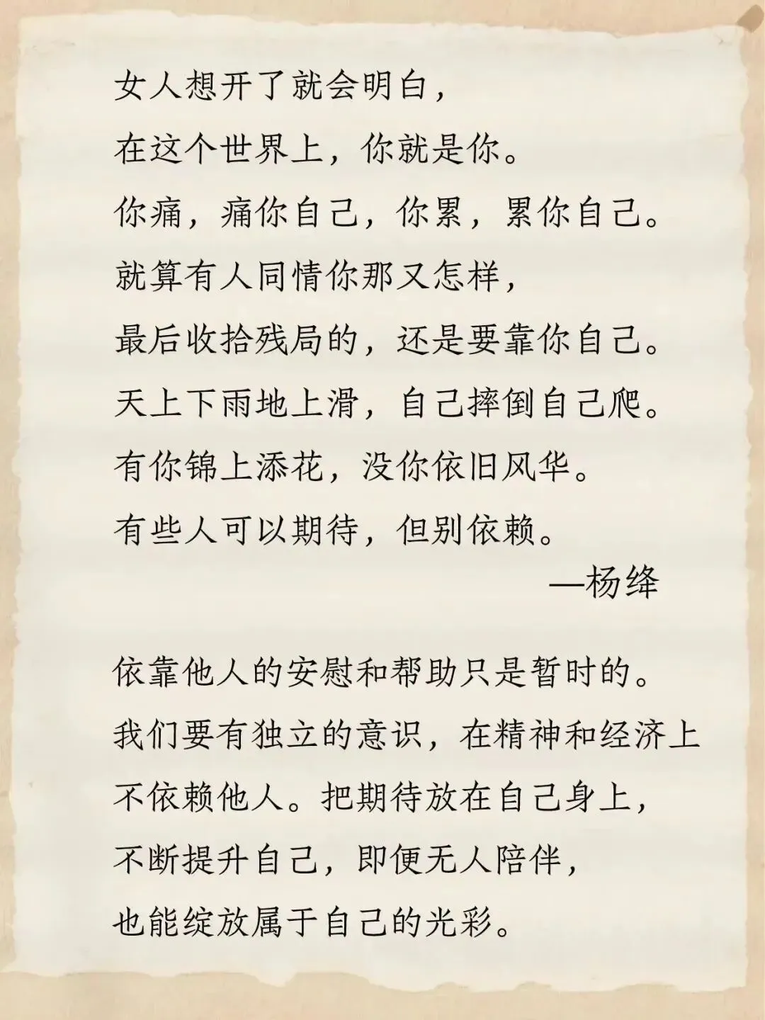 当你不再把全部重量压在关系上,当你重新成为那个完整、发光、有主见的自己,你会发现,你不再惧怕失去,因为你从未失去自己。
